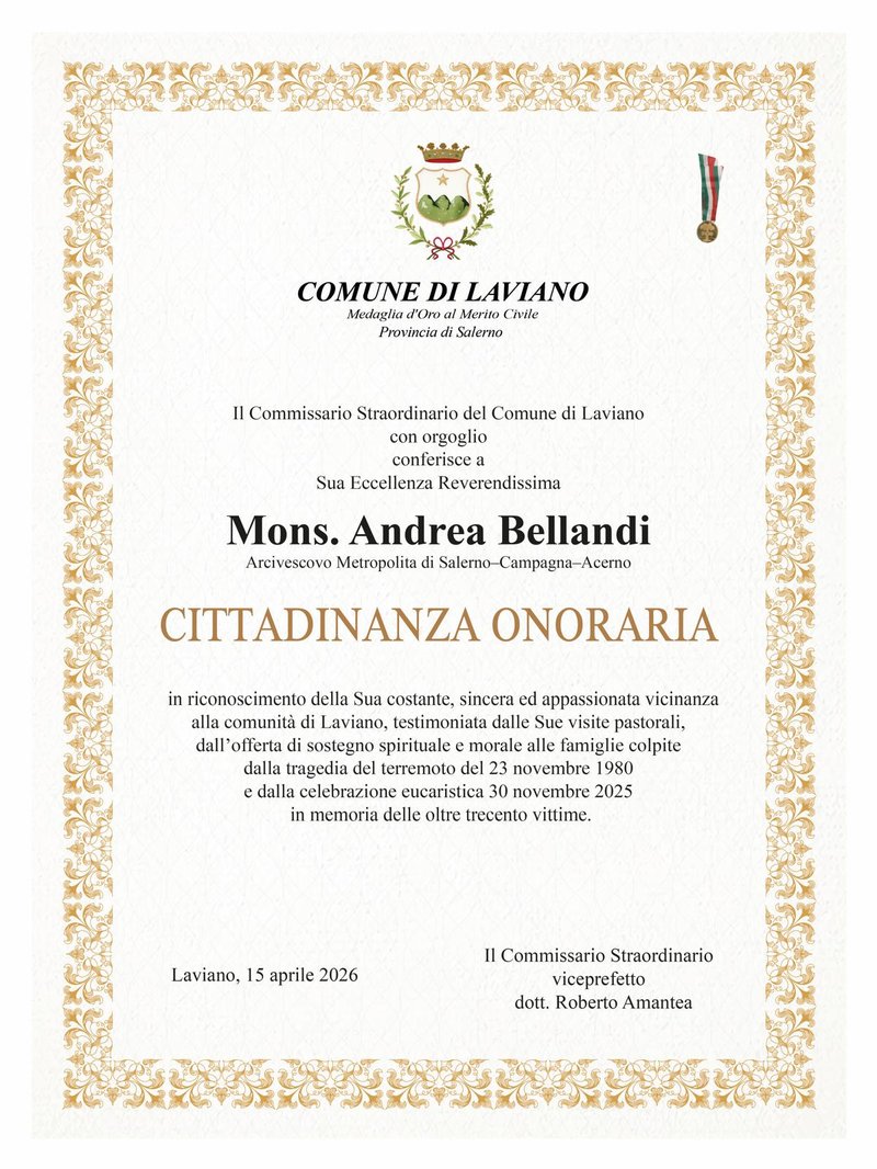 Il Commissario Straordinario del Comune di Laviano, con orgoglio, ha conferito a Sua Eccellenza Reverendissima la CITTADINANZA ONORARIA, in riconoscimento alle Sue visite pastorali, dall'offerta di sostegno spirituale e morale alle famiglie colpite dalla tragedia del terremoto del 23 novembre 1980 e dalla celebrazione eucaristica 30 novembre 2025 in memoria delle oltre trecento vittime.